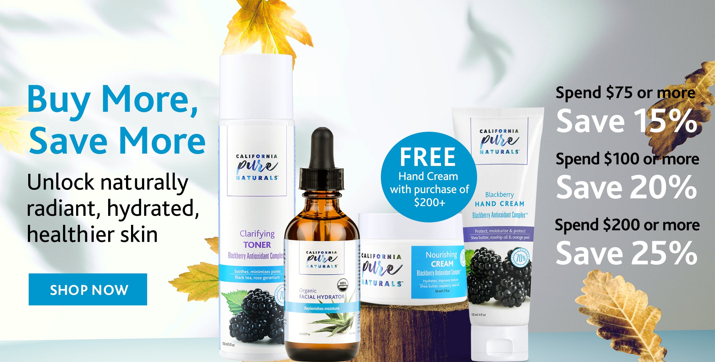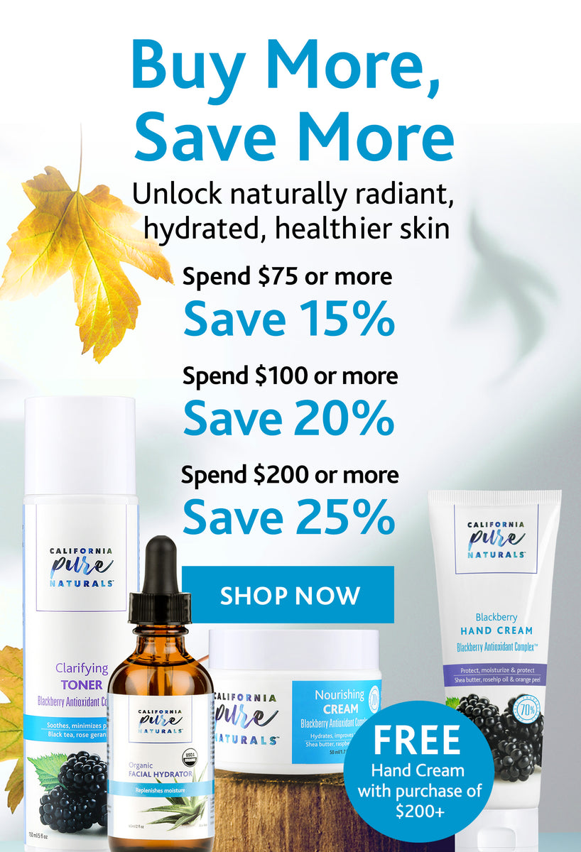 Here at California Pure Naturals, it’s our mission to provide natural skincare products and natural hair and body products that nourish your body as well as our planet! All of our dermatologist-grade personal care products utilize organic, California-grown fruits, herbs, and botanicals -such as argan, green tea leaves, and shea butter -to reinvigorate your body from the outside in. With a conscious effort to use local farms, California Pure Naturals is committed to environmentally-friendly beauty products that are both vegan and cruelty-free and are at least 70% organic.